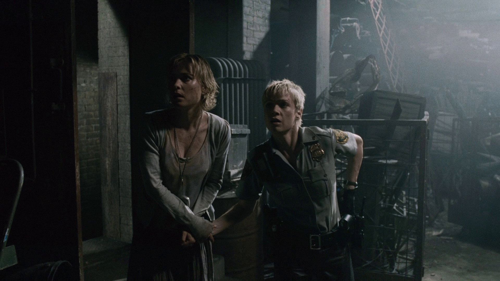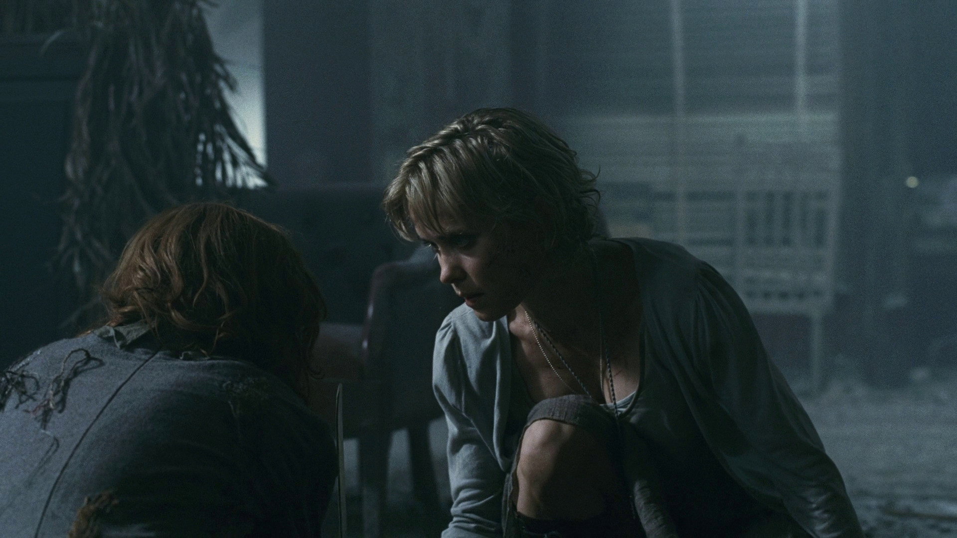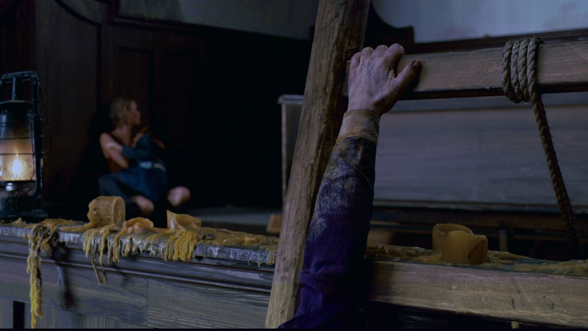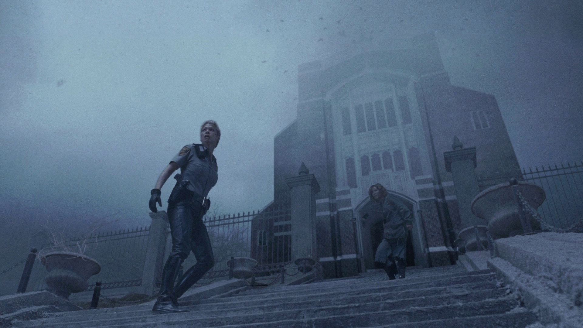 • Коли Алесса души́ть колючим дротом довговолосого хлопця з культу, схо́ди, де мала б бути Шерон, чітко ви́дні, але її там немає.