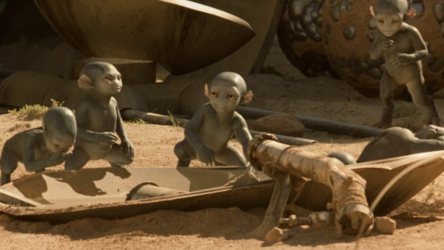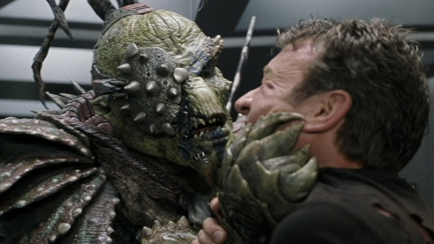 • Для рептилоїда Сарісса було вирішено використати технологію, спочатку розроблену для проєкту «Планета мавп», який тоді перебував у розробці. Вона дозволяла переносити вираз обличчя актора на зовнішній контур гриму. Над цим завданням працював Стен Вінстон (1946-2008) з того часу, як 20 років тому для проєкту The Star Wars Holiday Special створив голови Вукі.