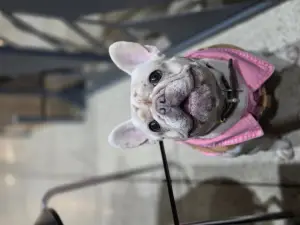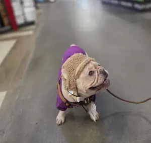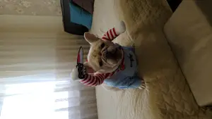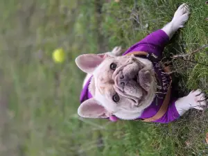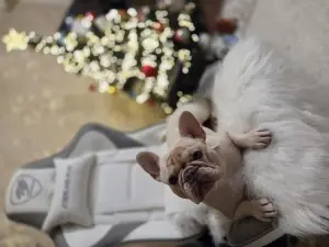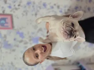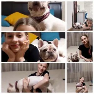 | Опис Французький бульдог, дівчинка, 3 роки. Рідкісний окрас кремовий. Знає базові команди. Собака-улибака. Любить дітей. Ладнає з іншими тваринами. |