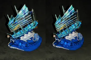 | Опис Фото -- стереокадри. Якщо правим оком дивитися на лівий напівкадр, а лівим -- на правий -- побачите вироб в об\'ємі. Авторська робота. Існує в одному екземплярі. Робилась для казки "Ера Невизначеності". |