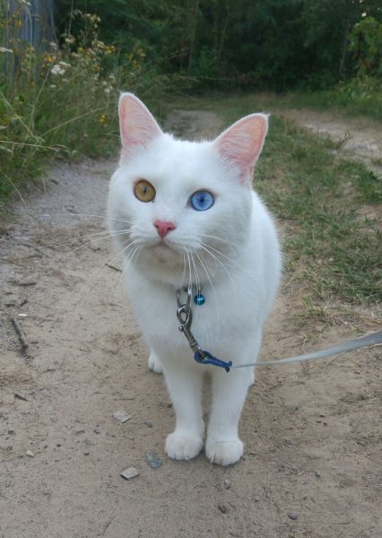 | Опис Кот чисто белый, один глаз голубой, а второй желтый. Кастрирован, людей не боится, дает себя гладить. |
